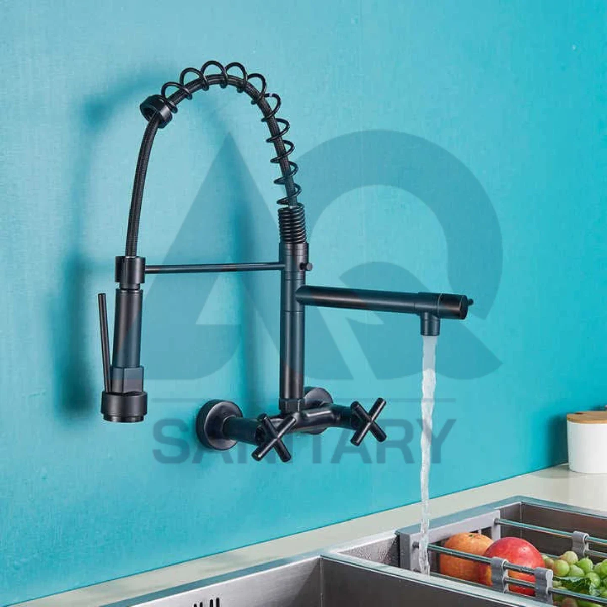 Modern wall-mounted kitchen mixer with flexible spring design and pull-down spray head. Perfect for heavy kitchen use, washing vegetables, dishes, and sink cleaning.