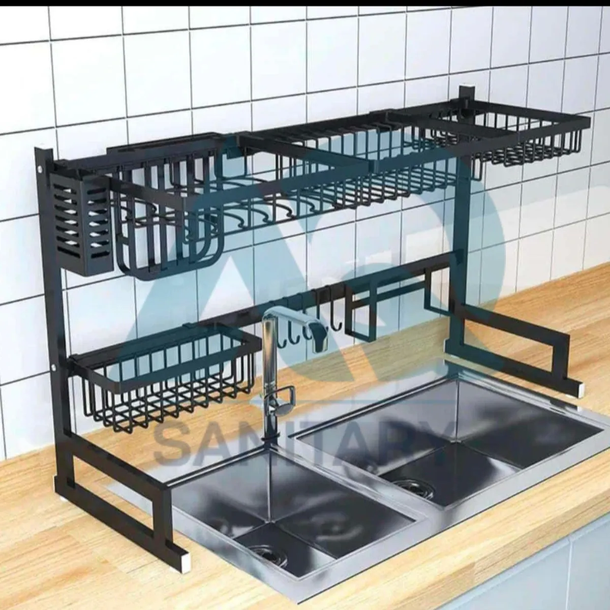 Upgrade your kitchen storage with this wall mounted kitchen rack featuring dish drying shelves and sink space. Durable metal build, modern black finish, perfect for Pakistani kitchens.